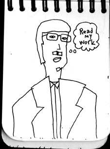 “What we are,” we said to them in the presentation room, the room where presentations are made, in the room with the guy who is actually the guy, while we’re giving them the Powerpoint presentation in such a way that it will make sense to the guy who is actually the guy, “is like a strand of DNA and shit like that. We’re like an email virus in a way. What I’m trying to say is, as Rob Wittig says, we’re like a rock and roll type model of collaboration. See, our agenda, that is, I mean, is to get people to read our shit, and better shit as well, you know what I mean, right? Alright, you see why reading is important? Can I get that martini now?” is what we said, more or less |