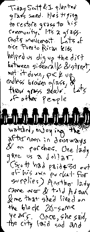 Today Scott and I planted grass seed. He’s trying to restore grass to his community. It’s a grass roots movement. Lots of nice Puerto Rican kids helped us dig up the dirt between sidewalk and street, wet it down, pick up endless broken glass, & throw grass seeds. Lots of other people watched, enjoying the afternoon in doorways and on porches. One lady gave us a dollar. (Scott and Adam had paid $40.00 out of their own pockets for supplies). Another lady came over and told Adam & me that she had lived on the block 20-some years. Once, she said, the city laid sod and people stole it. |