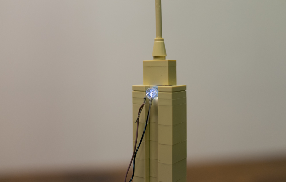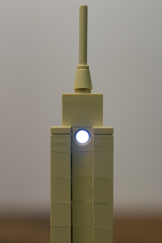 6. Insert the LED into the opening at the top of the Empire State Building Lego Model